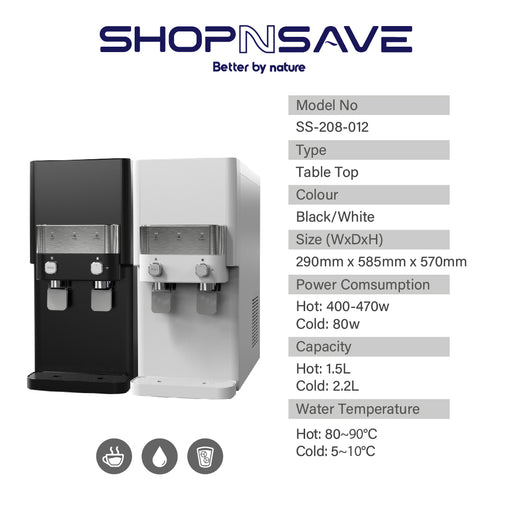 Model No: SS-208-012Type: Table TopColour: Black/WhiteSize (WxDxH): 290mm x 585mm 570mmPower Comsumption: Hot: 400~470w | Cold: 185wCapacity: Hot: ...
